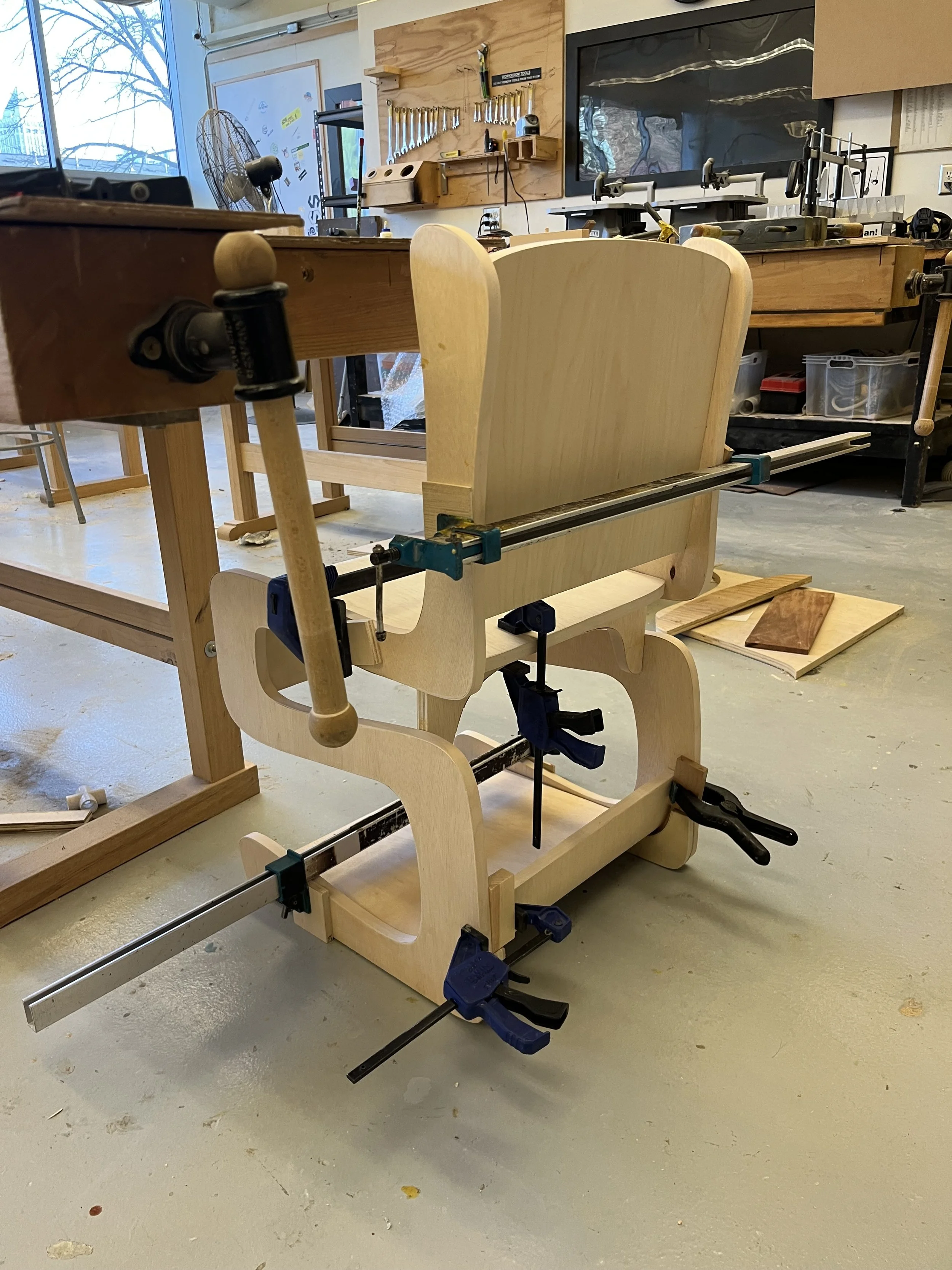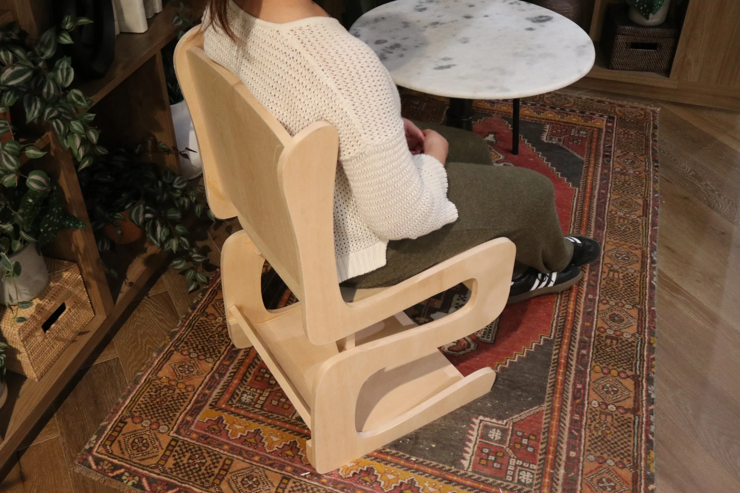 The ErgoBox, an ergonomic test rig, was used to optimize the chairβs angles and dimensions. Standard desk height was incorporated to ensure comfortable posture for users across a range of percentile heights.