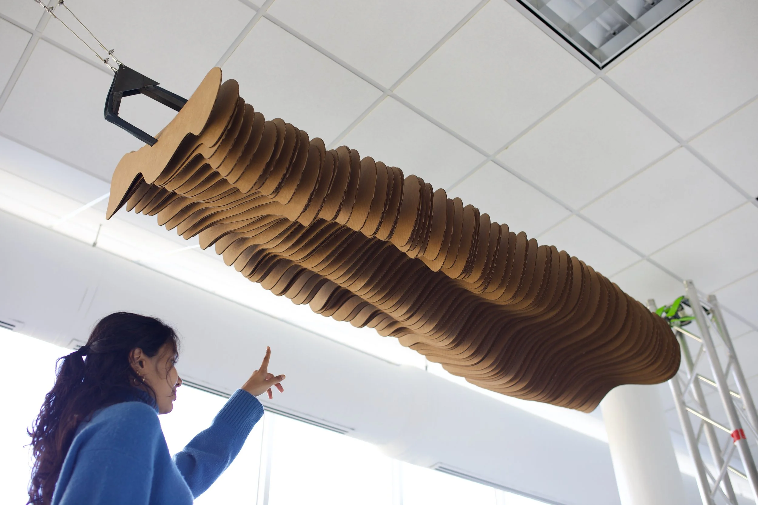 Its sturdy structure is balanced by the delicate intricacy of the tightly woven paper cord. Curved edges form invisible lines that bind Sabi and flow downwards, anchoring Sabi in the space it occupies.